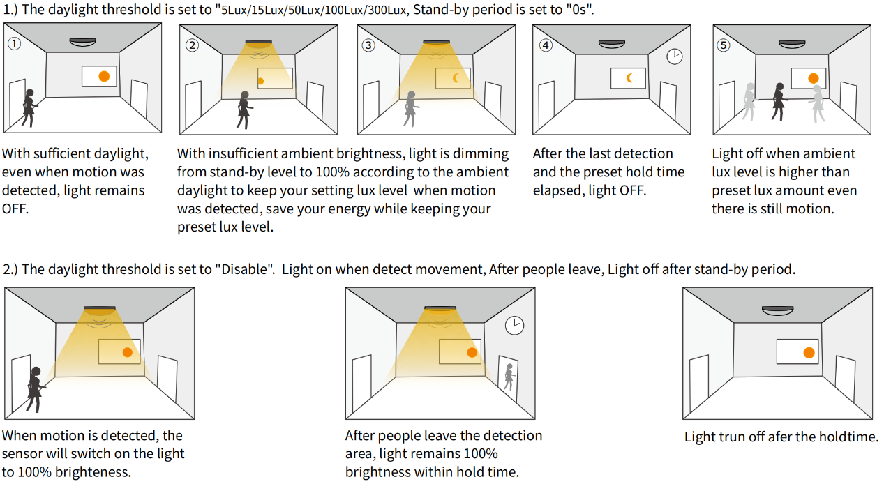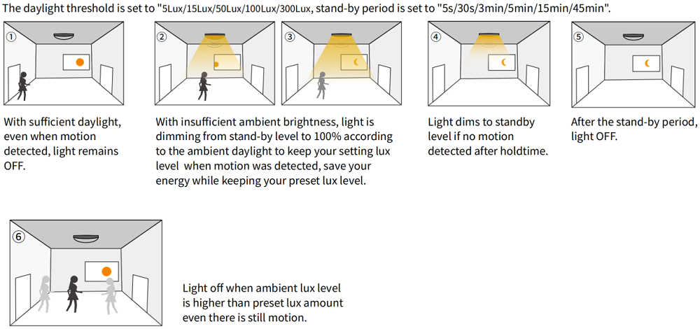 Takket være dual-PD-teknologien kan MC004-S02R-sensoren fortelle forskjellen mellom naturlig lys og kunstig LED-lys. Sensoren slår på lysarmaturene dine når omgivelseslyset er lavere enn innstillingsverdien, selv om det ikke registreres noen bevegelse. Når omgivelseslyset er opp til innstillingsverdien, vil sensoren slå av lysarmaturene selv om det fortsatt er bevegelse.