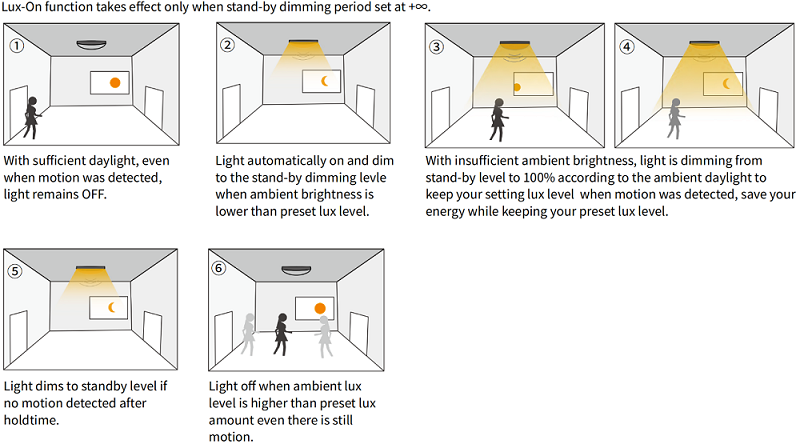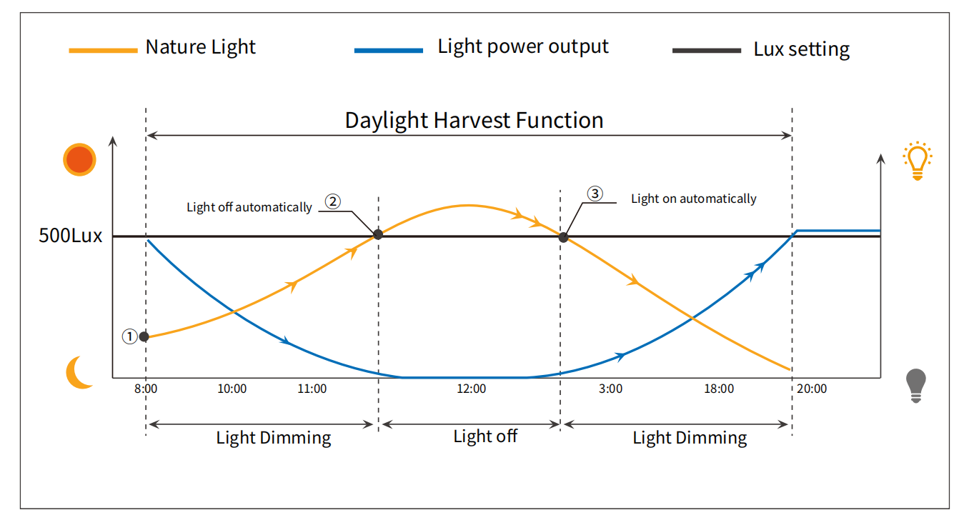 2.Auto Lux på/av-funksjon + Daylight Harvest-funksjon