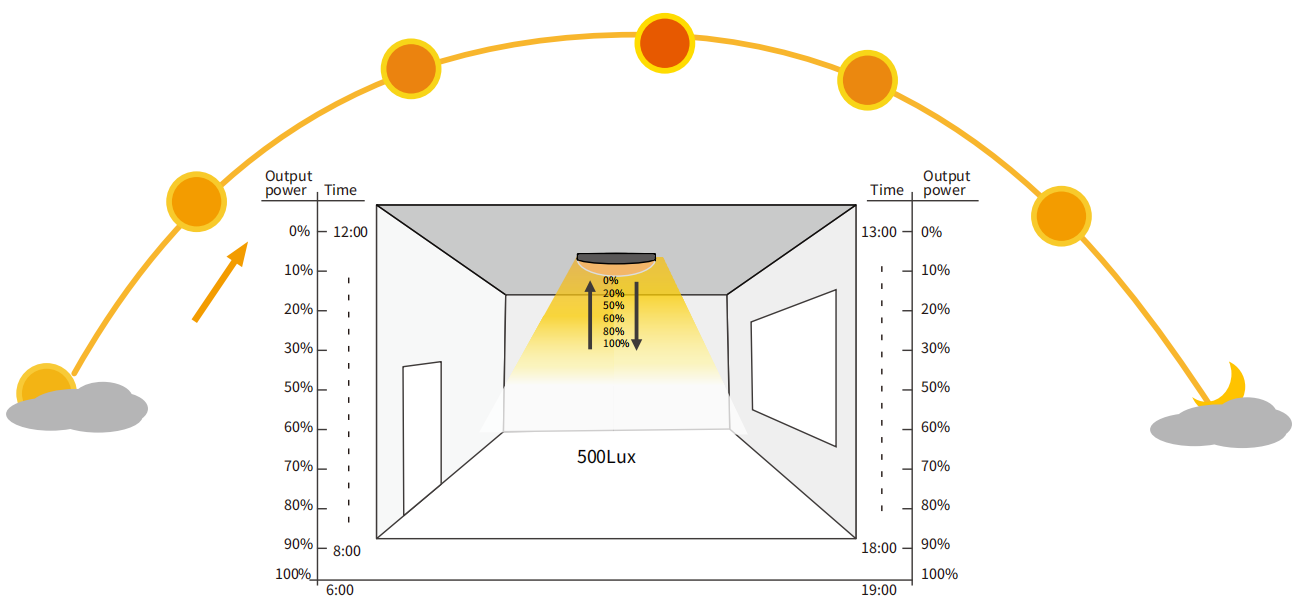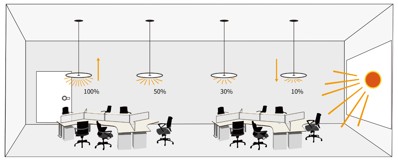 Når sensoren oppdager naturlyset, vil den dimme lyset, lysarmaturen dimmer utgangen som nedenfor: