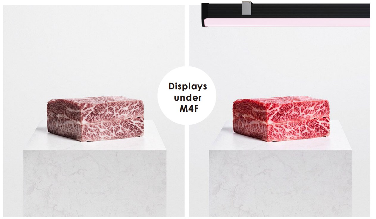 Basert på den ultraslanke stripelampen M4,Fanxstarhar gjort justering av lyskilden for å lage et spektrum 4000K+6500K+Rød 660nm spesielt for kjøttdelen i supermarkeder. Under belysningen av dette kjøttlysspekteret kan kjøttet vi selger i supermarkedene se saftigere og ferskere ut, og dermed øke salget av kjøtt.