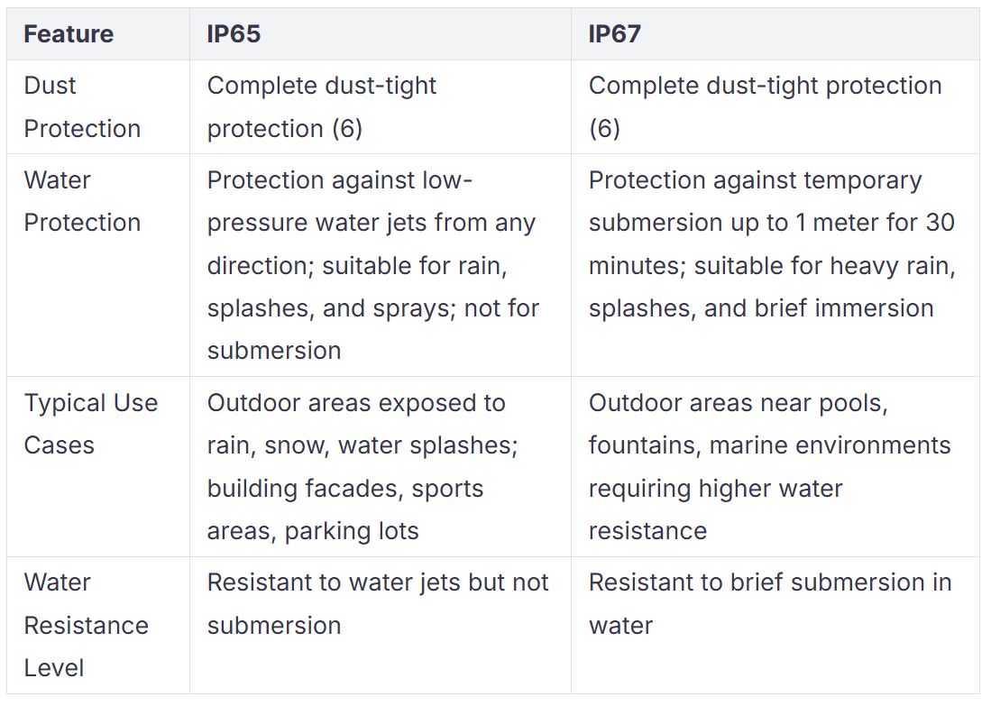 Når du velger LED værbestandig belysning, fokuser på hvor vanntett den er. IP-vurderingen viser hvor godt lyset holder støv og vann ute. For de fleste utendørs steder, velg lys med minst IP65. Denne vurderingen blokkerer alt støv og beskytter mot regn eller sprut. Hvis du bor nær havet eller har lys ved bassenger, trenger du sterkere beskyttelse. IP67-lys tåler å være under vann i kort tid. De er gode for våte eller marine områder.