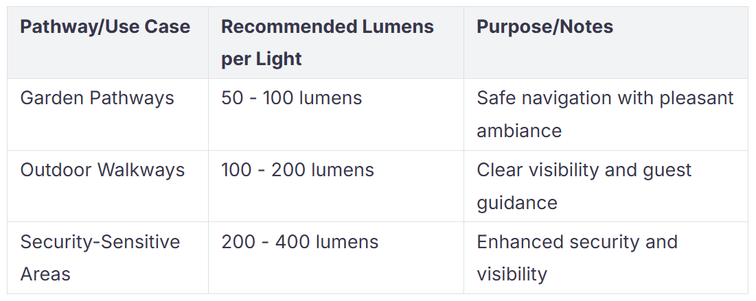 Det er viktig med trygge stier utenfor. Banebelysning hjelper folk å se hvor de skal gå. Den stopper også turer og fall. For hagestier, bruk lys med 50–100 lumen. Gangveier trenger 100–200 lumen for godt lys. Hvis du ønsker mer sikkerhet, bruk 200–400 lumen per lys. Sett utendørs LED-lys 6–8 fot fra hverandre for jevnt lys. Smale stier trenger lys nærmere hverandre. Brede stier kan ha lys lenger fra hverandre. Plasser lys ca 14 tommer over bakken. Dette gir en direkte stråle og gjør at stien ser fin ut.