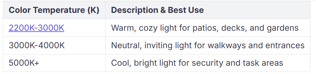 Å velge riktig fargetemperatur endrer hvordan rommet ditt føles og fungerer. Varmt lys, fra 2200K til 3000K, gjør at steder føles koselige og innbydende. Bruk denne til terrasser, dekk eller hager hvor du vil slappe av eller ha det gøy med venner. Nøytral hvit, mellom 3000K og 4000K, gir klart lys som ikke er for sterkt. Dette er bra for gangveier og innganger slik at du kan se godt uten å skade øynene. Kjølig hvit, over 5000K, er veldig lys og skarp. Bruk denne til sikkerhetsbelysning eller steder der du trenger å se alt klart.