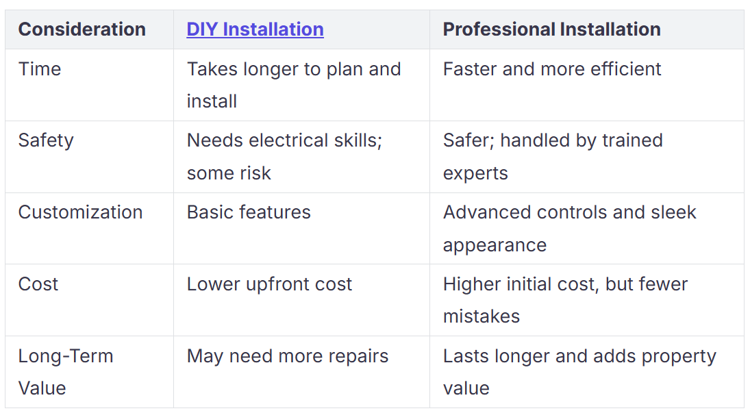 Å få en profesjonell koster mer, men gir deg eksperthjelp. Fagfolk bruker gode materialer og sørger for at lysene dine er trygge. De kan gjøre harde jobber og legge til spesielle funksjoner.