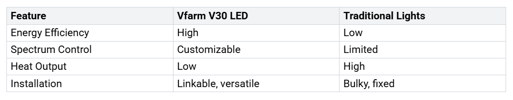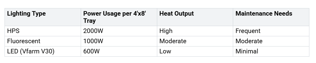 Energikostnader kan gjøre eller ødelegge innendørshagen din. LED-vekstlys skiller seg ut for sin bemerkelsesverdige effektivitet og lave energiforbruk. Når du bytter fra tradisjonelle høytrykksnatrium (HPS) eller fluorescerende lys til LED, kan du kutte energiforbruket ved å50–70 %. I storskala vertikalt jordbruk bruker LED ca600W per 4'x8' brett, mens HPS-systemer krever opptil 2000W for det samme området. Dette betyr betydelige energibesparelser og lavere strømregninger. Lysdioder avgir også mindre varme, noe som betyr at du bruker mindre på kjøling og kan plassere lys nærmere avlingene dine. Vfarm V30s integrerte driver og IP65 vanntette design sikrer pålitelig ytelse i krevende miljøer, noe som reduserer vedlikeholds- og driftskostnadene ytterligere.