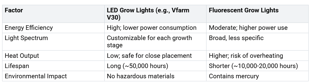 når de utsettes for en blanding av blått og rødt LED-lys. Cannabis sativa L. roots dra nytte avenergieffektivitet, plantehelse og vedlikehold. Lysdioder som FANXSTAR Vfarm V30 tilbyr tilpassbare lysspekter, lengre levetid og sikrere drift. Fluorescerende lys, som for eksempel T5-rør, bruker mer energi, genererer mer varme og har kortere levetid. De inneholder også farlige materialer som kvikksølv, som krever spesiell avhending.